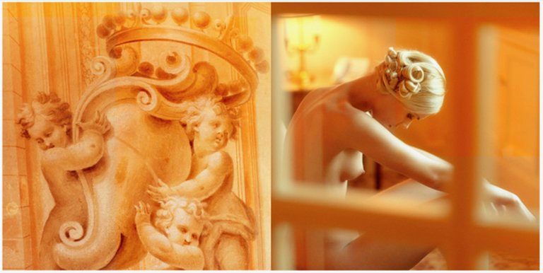 Harmonic play between a nude portrait through a window frame and a baroque fresco.