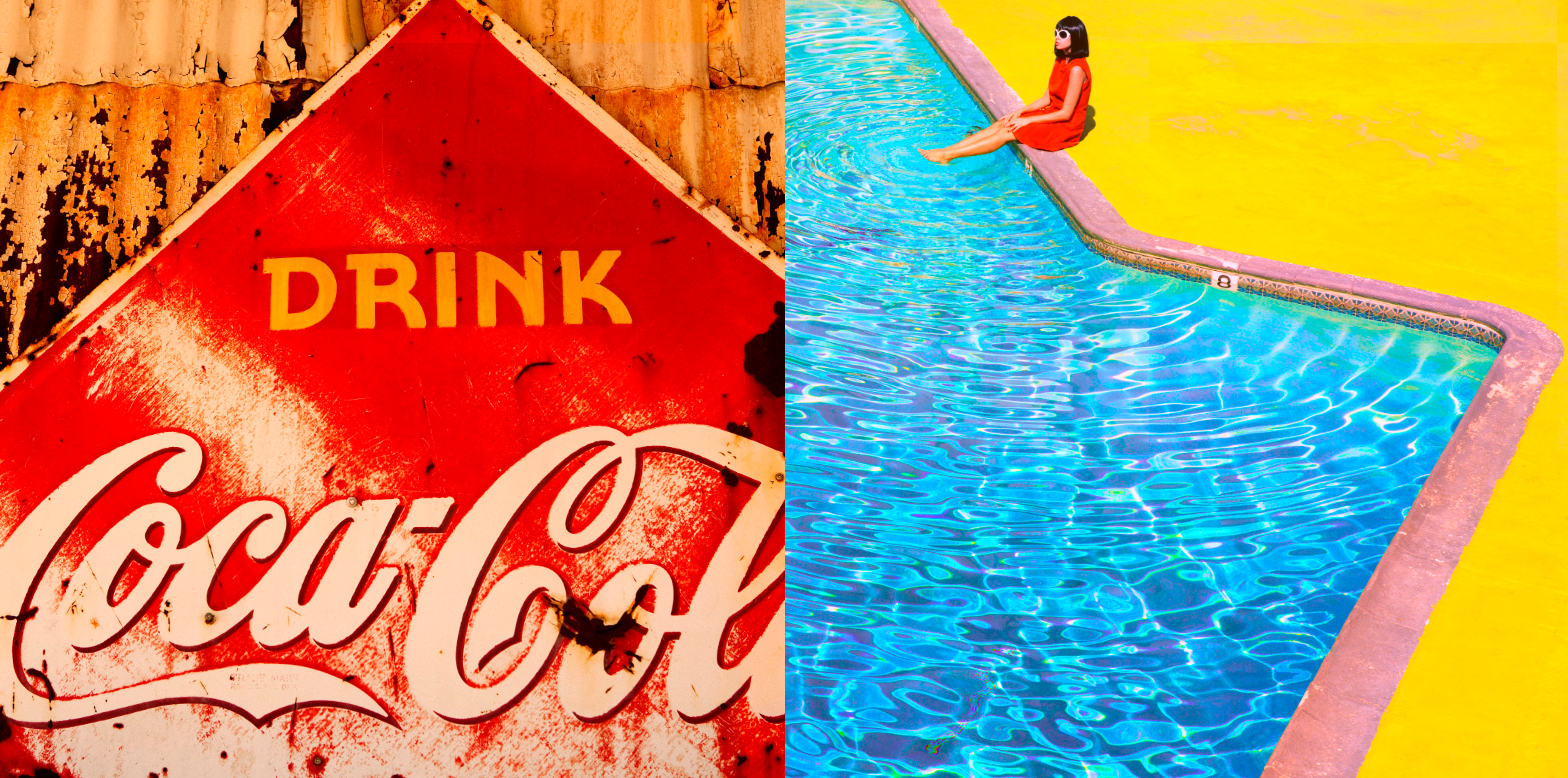 Colorful Pop Art inspired two-part picture of a model in a red dress sitting at the pool in the shape of a star. Blue-turquoise shimmering water is complemented with a detail of the Coca-Cola logo.