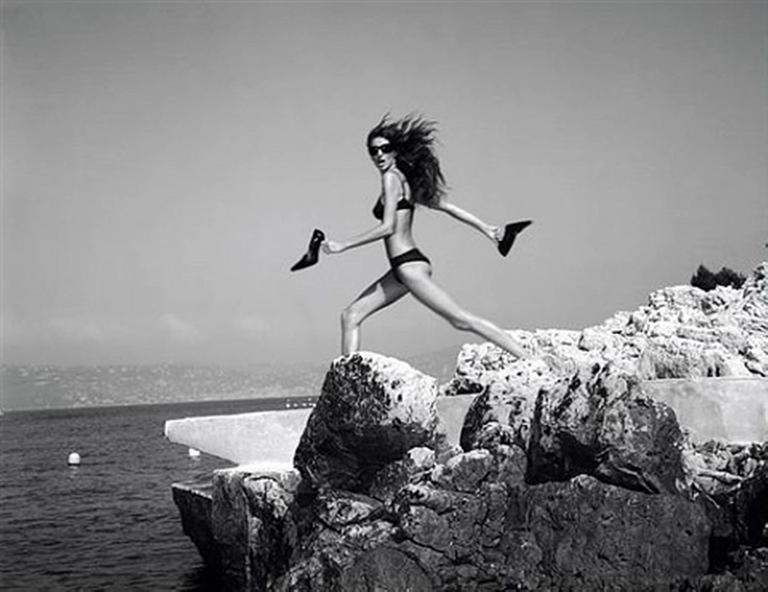 Stunning black and white picture of the supermodel jumping on rocks next to the sea/ocean at the Cote d’Azur.